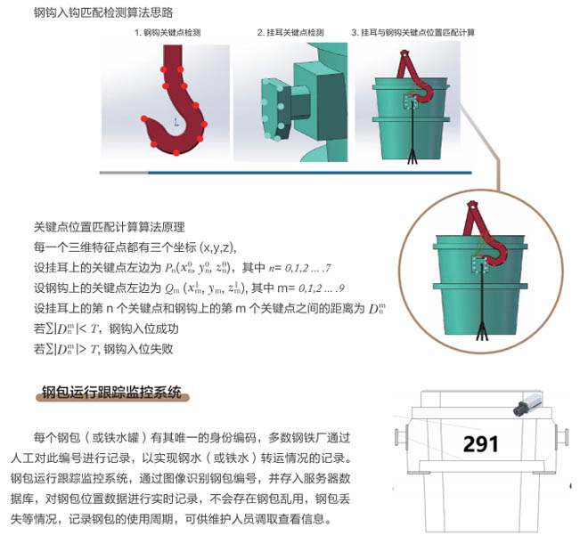近年來,冶金行業(yè)智能化、自動化、云時代等大數據廣泛應用,煉鋼車間是冶金行業(yè)的重點區(qū)域,廠區(qū)設備復雜、環(huán)境差、安全隱患多等因素更需要進行設備自動化、智能化的升級管理、實現(xiàn)廠區(qū)無人化智慧工廠目標的發(fā)展。起重機作為煉鋼、煉鐵、軋鋼車間的主要設備,起重機工作中對在工位操作越來越精準,需要駕駛員及時準確觀察工位狀態(tài),由于駕駛室的位置和現(xiàn)場的工況環(huán)境影響經常引起操作失誤,鋼包起吊安全事故頻發(fā),特別是對于鋼包掛鉤是否完整嵌入掛耳,是否進入正確的起吊姿態(tài)沒有直接的判斷和監(jiān)控。研發(fā)起重機鋼包定位掛鉤識別管理系統(tǒng)是安全生產的剛性需求。