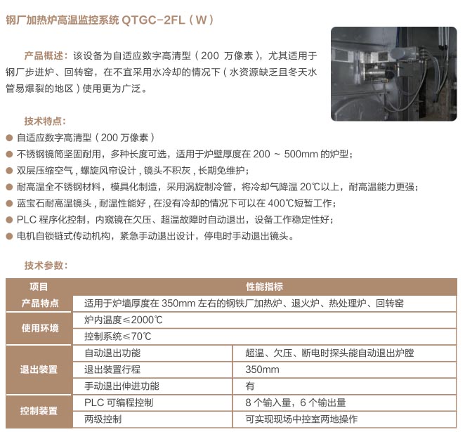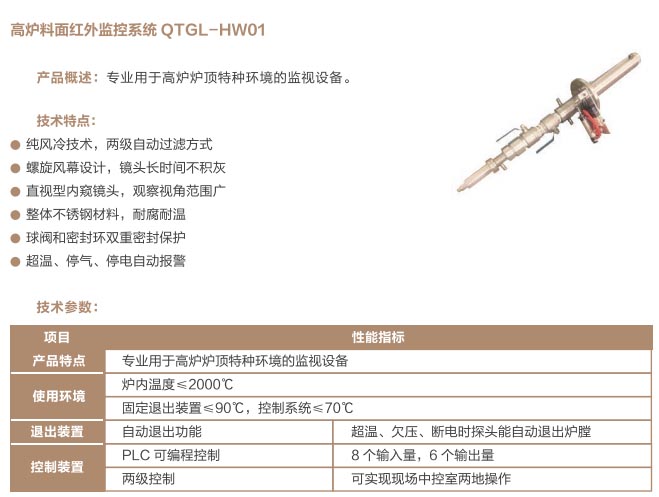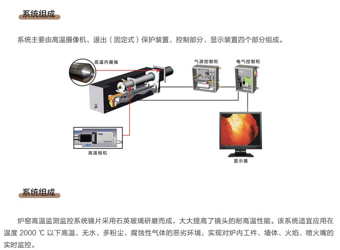 爐窯高溫監(jiān)測監(jiān)控系統(tǒng)是專為工業(yè)高溫爐窯監(jiān)測監(jiān)控的設(shè)計的智慧管理平臺,是針對爐壁開孔和爐窯視像有嚴(yán)格要求的高溫爐窯而研制的高溫工業(yè)電視。利用特種高溫孔式光學(xué)鏡頭,鏡頭設(shè)計采用中繼物鏡,兩次成像系統(tǒng),使像面在遠(yuǎn)離觀察孔的CCD靶面上形成,最大限度的減少進(jìn)入攝像機(jī)的熱輻射,致力為冶金、電力、建材、礦山、化工等行業(yè)服務(wù)。我公司研發(fā)主導(dǎo)產(chǎn)品已擁有第三代SG內(nèi)窺式高溫工業(yè)電視系列、爐壁式高溫工業(yè)電視系列、內(nèi)窺式拐角高溫工業(yè)電視系列、鍋爐汽包水位電視系統(tǒng)等成套設(shè)備,以及各種風(fēng)冷防護(hù)罩,水冷防護(hù)罩,渦旋制冷防護(hù)罩等工業(yè)監(jiān)控設(shè)備配套產(chǎn)品。產(chǎn)品廣泛應(yīng)用于鋼鐵廠加熱爐、退火爐,電廠鍋爐爐膛火焰、水泥廠回轉(zhuǎn)窯窯頭看火、篦冷機(jī)看料、玻璃廠玻璃熔窯等特殊高溫環(huán)境。幫助用戶進(jìn)行工業(yè)爐實(shí)時電視監(jiān)測及控制,解決設(shè)備的運(yùn)行故障等,對用戶改善產(chǎn)品質(zhì)量、降低成本、安全生產(chǎn)有著獨(dú)特的成效。受到了用戶的一致好評。
